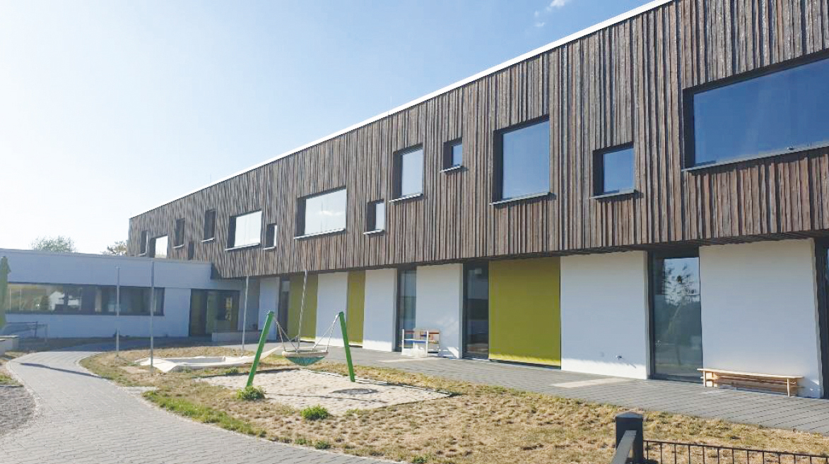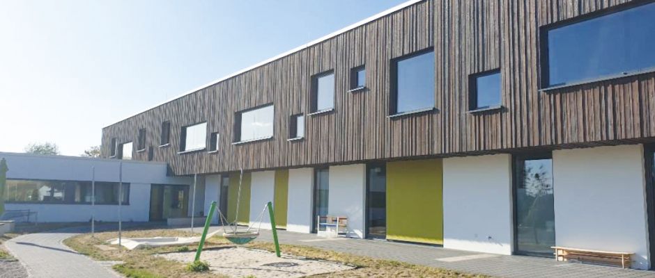 2-geschossiger Neubau, Gebäude in Hanglage, Erdgeschoss in Massivbauweise, Mauerwerk und Stahlbeton, Obergeschoss in Holzbauweise aus Brettsperrholz (Wände und Decke), 6-gruppige Kita + 2 Krippe-Gruppen.